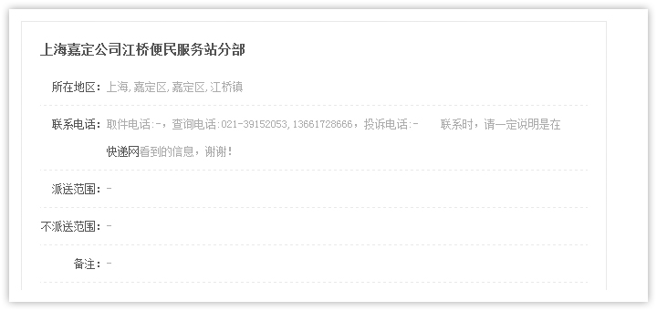 2、查詢(xún)結(jié)果頁(yè)面顯示符合條件的快遞公司網(wǎng)點(diǎn)列表,顯示快遞網(wǎng)點(diǎn)所在區(qū)域,公司地址和聯(lián)系電話(huà),如需查看更多信息,點(diǎn)擊 【查看詳情】進(jìn)入網(wǎng)點(diǎn)詳細(xì)頁(yè)面查看。