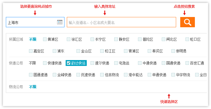 1、進(jìn)入 2、查詢(xún)結(jié)果頁(yè)面顯示符合條件的快遞公司網(wǎng)點(diǎn)列表,顯示快遞網(wǎng)點(diǎn)所在區(qū)域,公司地址和聯(lián)系電話(huà),如需查看更多信息,點(diǎn)擊 【查看詳情】進(jìn)入網(wǎng)點(diǎn)詳細(xì)頁(yè)面查看。 3、點(diǎn)擊網(wǎng)點(diǎn)名,即可進(jìn)入網(wǎng)點(diǎn)詳情頁(yè)查看詳細(xì)信息。